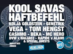 Joining them are Kool Savas(Opens in new tab), Genetikk(Opens in new tab), Vega(Opens in new tab), Kolja Goldstein(Opens in new tab), Tom Hengst(Opens in new tab), Beka(Opens in new tab), Cashmo(Opens in new tab), Rapide x Alawai(Opens in new tab), MC Hero(Opens in new tab) sowie DVW x Naija03(Opens in new tab) – a lineup of over 13 national and international artists, live on 28.02.2026.